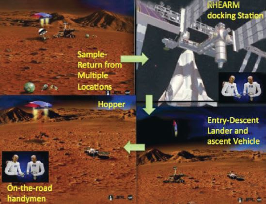 • REARM-dock that would orbit Mars could host both the spaceship traveling between Earth and the Martian orbit, as well as the REARM-spacecraft. It would repeatedly receive cargo shipped from Earth. It could also receive samplereturn containers and would load them into the Earth spaceship for return to Earth. A compartment has been envisioned in the middle of the REARMdock that would perform the exchange of cargo between the Earth spaceships and the Martian REARM-spacecraft. The cargo coming from Earth could include caches of propellant, MPEs (modular propulsion elements), batteries, spare parts for the rovers or REARM system, as well as new science payloads, which could be installed on existing rovers and sample-return containers.