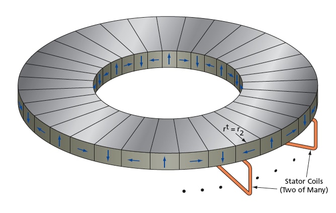 In an axial Halbach magnetic bearing, the basic Halbach arrangement is modified into a symmetrical arrangement of sector-shaped permanent magnets in a disk on the rotor (see Figure 2). The magnets are oriented to concentrate the magnetic field on one of the axial faces of the disk — the lower face in Figure 2. The stator coils are mounted in a symmetrical arrangement below the disk.