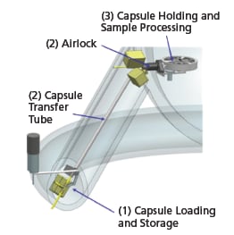 The system comprises three main subsystems: (1) capsule loading and storage, (2) capsule transfer and airlock, and (3) capsule holding and sample processing. The design includes a capsule that can be constructed from materials such as beryllium, with variations including a window for observation. The entire system is expected to weigh around 1.9 kg, excluding additional components like valves and actuators.