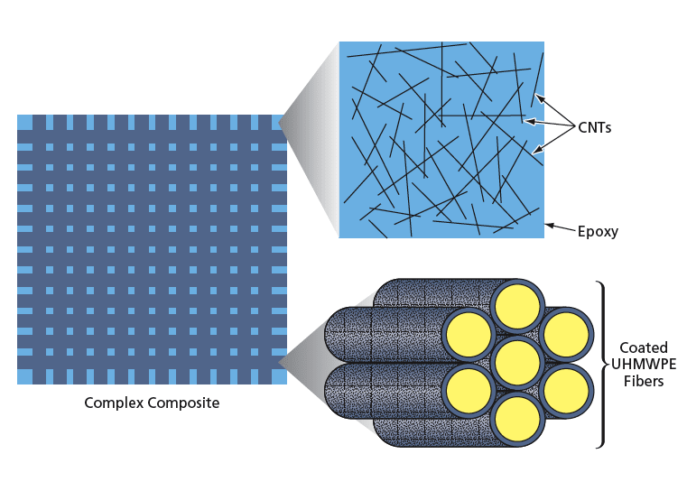 - Using a polymer/CNT composite as the matrix ingredient of a complex composite that includes any of a variety of other fibrous reinforcing materials.