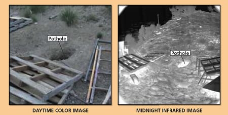 The method involves exploitation of the fact that throughout the night, negative obstacles are usually warmer than the surrounding terrain. Therefore, in infrared terrain images acquired at night, negative obstacles usually appear brighter than the surrounding terrain(see figure). (During the day, the negative obstacles can be warmer or cooler than their surroundings, depending on sky conditions and the apparent position of the Sun.) At the present state of development, the method is embodied in a rudimentary algorithm that processes a combination of infrared imagery and range-versus-elevation data. The algorithm identifies candidate negative obstacles in the form of infrared bright spots on the terrain, then performs simple geometric tests to confirm or reject the candidate negative obstacles. The algorithm has been shown to be sufficient for initial proof-of-concept demonstrations. Further development of this or an improved algorithm will be necessary to enable reliable detection of negative obstacles under a variety of conditions.