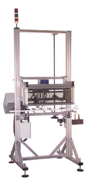 The RS-100, whose speed may be selected to match its environment, is designed to test directly over an already active continuous conveyor, having a jack height adjustment, no tooling requirement (no timing screw) and not necessitating a backlog of bottles prior to installation. The tester automatically tracks, follows, and tests the bottles as they travel through its segment of the production line. Once installed, the tester is programmed to run 24 hours per day, seven days per week as a production-monitoring tool for the plastic bottle blow molding production line. An encoder wheel on the side of the machine is positioned to ride on the conveyor and give input of its speed (so operators can match the slide speed to the conveyor speed), while a status light is fitted to the top of the tester’s frame to alert operators of a bottle jam or other malfunction.