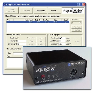 New Scale Technologies (Victor, NY) offers the SQ-2300 series benchtop motor controller for computer control of the company's SQUIGGLE motors and closed-loop linear nanopositioning stages. Using the controller, SQUIGGLE motor speed can vary continuously from micrometers per second to millimeters per second with better than 20-nanometer position resolution. Multiple controllers can be connected to one PC and driven simultaneously from a single screen, enabling multi-axis set and hold positioning. The unit comes with an ActiveX command library and USB connection, and can also be controlled by an analog input (0 to 3.3 volt) or optional manual handset.