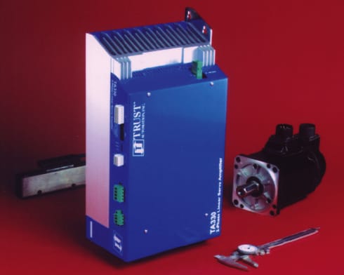 The TA330 linear three-phase servo drive from Trust Automation (San Luis Obispo, CA) is a 150-V, 900-W continuous (2700-W peak) linear drive. It can be configured to interface with any motion controller, including three-phase DC brushless servo motors using Hall Effect sensors, three-phase AC brushless motors using external sinusoidal commutation, single-phase DC brushed servo motors in bridged mode, and brushless linear motors. With low electrical noise, the TA330 is designed for integration in or near systems with noise-sensitive circuitry, such as sensors and transducers. It can be used with high-inertia mismatched stages and low inductance motors.