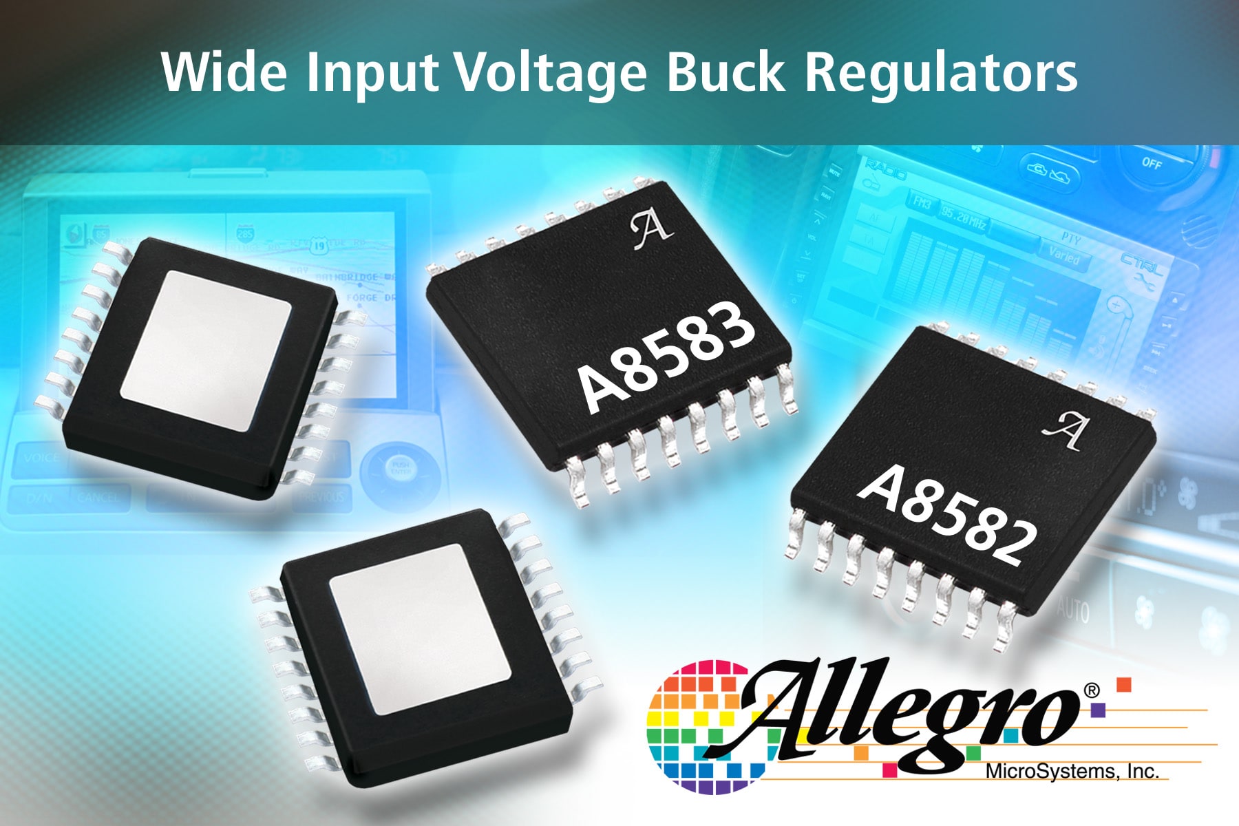 Allegro MicroSystems (Worcester, MA) has announced two new robust automotive grade buck regulators with high switching frequency and output current, each integrating a low resistance, high-side, N-channel MOSFET. Allegro’sA8582/A8583 devices incorporate current-mode control to provide excellent loop stability and transient response. Both devices regulate input voltages from 4.7V to 36V down to output voltages as low as 0.8V, and are able to supply load current of at least 2A (A8582) or 3.5A (A8583). Protection features include VIN under voltage lockout (UVLO), cycle-by-cycle over current protection (OCP), hiccup mode short-circuit protection (HIC), over voltage protection (OVP), and thermal shutdown (TSD).