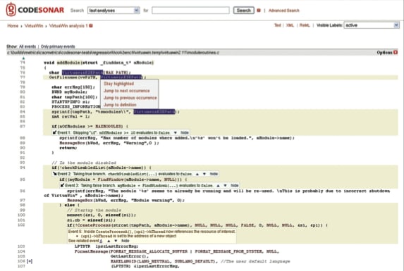 CodeSonar is a static source code analysis tool that uses a different technology for detailed inter-procedural source code analysis. CodeSonar analysis typically takes longer to complete than comparable tools, but can reveal more subtle types of defects and suspect coding patterns, requiring deeper path analysis (which can be more time-consuming).