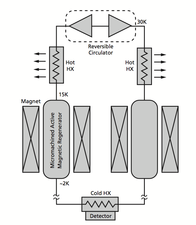 This magnetic cooler will enable cryogenic detectors for sensing infrared, x-ray, gamma-ray, and submillimeter radiation in future science satellites, as well as the detector systems in the Constellation-X (Con-X) and the Single Aperture Far-Infrared observatory (SAFIR). Scientific applications for