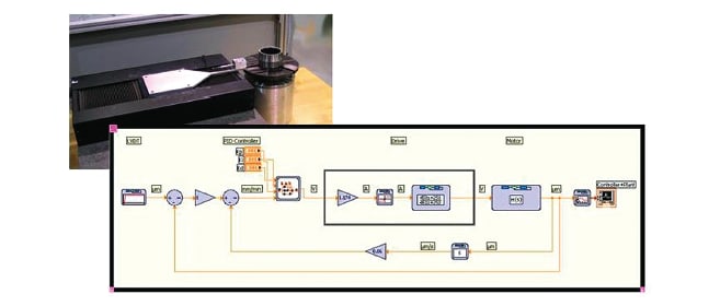 The NI LabVIEW Simulation Module was used to develop simulations of the various control loops in the system. For example, a motion control loop was modeled using a subsystem for the PID control law used in the motion controller, a transfer function for the motor drive along with a saturation block, and the transfer function representing the motor dynamics. Both position and velocity feedback were included in the model.