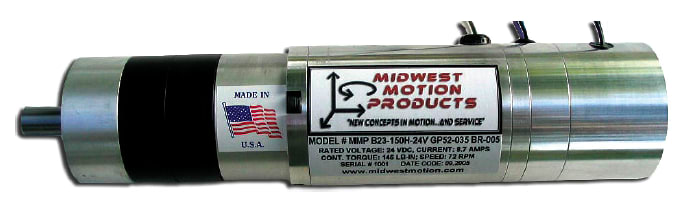 Midwest Motion Products (Watertown, MN) offers the MMP-B23-150H-24V GP52-035 BR-005 brushless DC gearmotor/brake that features Hall Cell Commutation. The gearmotor measures 2.3" in diameter by 9.2" long, and has a keyed output shaft of 12 × 25 mm. Mounting is accomplished with four face-mount M5 threaded holes, equally spaced on a 40-mm diameter B.C.