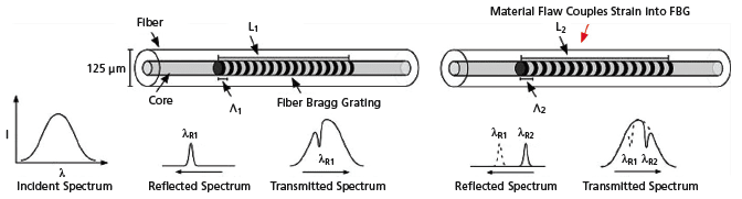 Distributed sensing techniques that employ fiber Bragg gratings (FBGs) have become a popular choice for integration with composites as they afford much higher resolution than time domain techniques and this translates into much more robust fault detection within the material. The basic idea is that multiple FBGs can be located along the length of an optical fiber, each acting as a discrete strain sensing point or location within the composite once the fiber is integrated into the material. The sensor is then interrogated with a spectrum of input light and the reflected FBG spectrum is measured and translated into strain. The problem with this approach is that one is never guaranteed that a failure in the material will occur close enough to an FBG location to allow for strain transfer and, thus, fault detection.