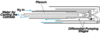The apparatus described operates stably and reproducibly at low power levels (10 to 300 W) and has been shown to produce a beam with a relatively high flux of monatomic nitrogen, which is essential for successful incorporation into the growing semiconductor layers. The design includes a constricted nozzle that forms a free jet of nitrogen gas, which is seeded with argon to facilitate spectroscopic analysis. A cathode strikes an arc within the nozzle, creating a high-speed laminar flow of gas that transitions from a high-pressure zone to a low-pressure outlet in the vacuum chamber, minimizing pressure and enhancing the quality of the nitrogen beam.