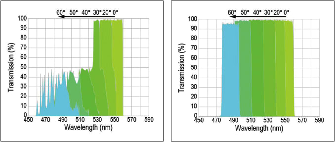 In order to overcome these shortcomings it is necessary to develop new filter technologies with advanced designs that maintain steep (bandpass) edges, high transmission, and out-of-band blocking with essentially no or little polarization dependence. The introduction of new (proprietary) filter technology has led to the development and introduction of both bandpass and edge filters that overcome all of the shortcomings discussed above. An example of the filter performance of this new filter type is displayed in Figure 2(b). In contrast to the spectrum of the bandpass filter shown in Figure 2(a), this new innovative design results in high transmission, steep edges, and excellent out-of-band blocking over the full range of angles from 0° to 60°.