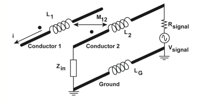 Figure 2 shows magnetic coupling between wires. As mutual inductance is only defined between separate current loops, there is none between the common ground conductor and conductors 1 or 2. Mutual inductance provides the coupling path for magnetic coupling, which is more difficult to reduce than capacitive coupling because magnetic fields can penetrate conductive shields.