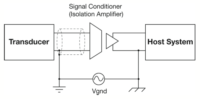 An effective method of isolation uses signal conditioners based on transformers or optical couplers, shown in Figure 3. The common-mode noise voltage appears across the isolation device internal to the signal conditioner, and noise coupling is reduced to the parasitic capacitance across the isolation barrier.