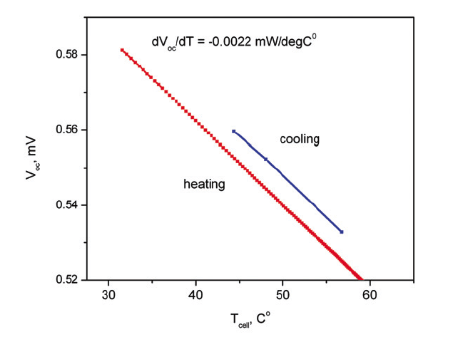 The difference in temperatures is apparent when the parameter (e.g. open-circuit voltage) is plotted against temperature (at the back of the cell) when the cell is heated or cooled (Figure 2). As the best estimate of the open circuit voltage, the two lines in Figure 2 can be extrapolated to 25°C using the temperature coefficient, and the midpoint of the two Voc intercepts at 25°C can be calculated. For more accurate measurement, we let the cell equilibrate at room temperature and measure the parameters using only momentary illumination (~ 1 sec). The measurement then is extrapolated to 25°C using their respective temperature coefficients.