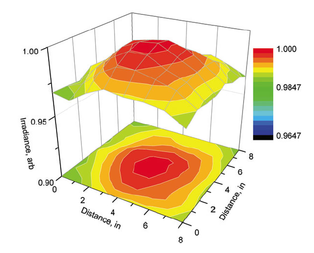 Solar simulator light is typically more concentrated in the center (around the optical axis) than at the edge of the illuminated area and maps into a domed surface, the height of which can be used as a metric for spatial non-uniformity. Spatial non-uniformity is minimized (under 2%) in Class AAA solar simulators like the Sol3A from Newport Oriel (Figure 4). The residual amount of spatial non-uniformity causes irradiance error that is proportional to the relative areas of the solar reference cell and device under test, and on the relative locations of the two cells within the working plane of the solar simulator. Alternatively, a factor (analogous to the spectral mismatch factor) can be calculated and applied to correct for this error2.