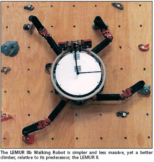 The figure shows the LEMUR IIb, which is a modified version of the LEMUR II — the second generation of the Limbed Excursion Mechanical Utility Robot (LEMUR). Except as described below, the LEMUR IIb hardware is mostly the same as that of the LEMUR II. The IIb and II versions differ in their kinematic configurations and characteristics associated with their kinematic configurations. The differences are such that relative to the LEMUR II, the LEMUR IIb is simpler and is better suited to climbing on inclined surfaces.