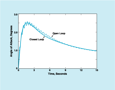 A generic representation of a hypersonic vehicle has been used to demonstrate this method. A range of natural frequencies and damping parameters for the structural dynamics of the vehicle, based on previous computational studies, was assumed. A linear model including representations of the aerothermoelastic effects was formulated by describing the parameters of the structural dynamics as functions of temperature. A flight controller to actively damp the bending-mode response of this model was designed. The figure shows the open-loop and controlled (closed-loop) responses to an elevator command during a simulated flight with a fast variation of temperature. The open-loop response includes an oscillatory component from the bending mode, whereas the closed-loop response shows that the controller is able to continuously damp this elastic effect despite the time-varying temperature.