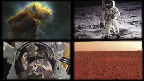 Images like these of (clockwise from top left) the Eagle Nebula, Apollo 11 astronaut Buzz Aldrin on the Moon, the Martian landscape, and an astronaut self-portrait taken during a spacewalk bring the wonders of space exploration down to Earth.