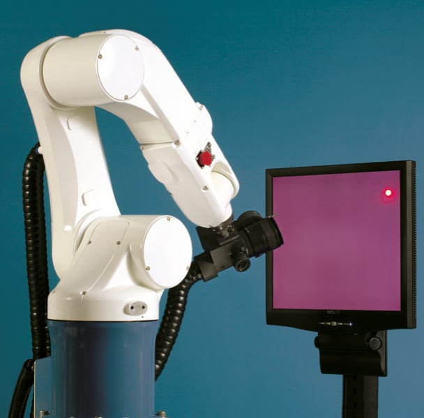 Another method employed by some National Measurement Institutes and commercial laboratories utilizes 6 axis industrial robots to move the sensors to the various angular positions to map the intensity and color variations. The robots employed have spatial position placement and repeatability on the order of 0.050mm over a 1.5 meter or greater reach radius. The advantage of using a robot over a traditional goniometer is the flexibility it affords to make measurements on other types of sources such as LED back-lit flat panel displays.