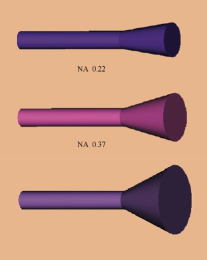 The wide acceptance angles and large core diameters available in specialty fibers help in a variety of ways. A wide acceptance angle (high NA) makes gathering light from a sample easier and more efficient, for instance, because it eases restrictions on alignment and simplifies lensing (Figure 2). The same is true in reverse, when the fiber carries an illumination source such as the helicopter-carried laser. The large core diameters also help ease lens requirements by allowing larger spot sizes. If fibers are used in a bundle, large cores yield greater active areas at the bundle’s end, resulting in greater light gathering efficiency.