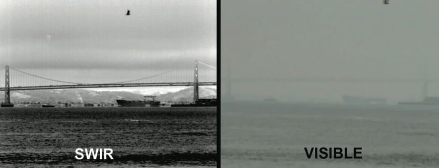 The ability to see clearly over long distances seems to be diminishing, globally, whether due to the rising pollution levels of growing urban development or more natural causes. Haze, once only an urban challenge, now even compromises the view in remote locations like Death Valley, California. In probably one of the best examples of imaging in the SWIR wavelength, Figure 2 shows how scene detail, lost to the visible eye for ranges a little greater than 5 km, is rendered in crisp detail for ranges well beyond 20 km. Up to a point, as Figure 3 illustrates, there are also clear benefits of SWIR imagery over visible imagery when it comes to dust. The smaller, lighter wind-borne dust particles that hang in the air the longest are transparent to the SWIR, yet continue to obscure normal visibility. In perhaps the most dramatic example of the SWIR advantage, Figure 4 shows how the typical San Francisco Bay morning maritime fog and mist is no impediment. Finally, almost as striking is the ability of the SWIR to see through the smoke of a forest fire as shown in Figure 5. Similar examples can be found with photochemical smog and other atmospheric obscurants prevalent in many urban environments.