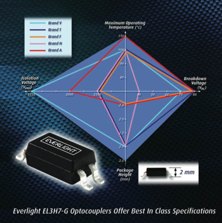Everlight Electronics (Caroll-ton, TX) has introduced 4-pin SSOP phototransistor optocouplers. The phototransistor opto-couplers feature a low-profile (2mm) package, high isolation voltage (3750 Vrms), minimum creepage distance (5mm), wide operating temperature range (-55°C to +110°C), multiple current-transfer-ratio (CTR) bins, and high breakdown voltage (80V). The devices are well suited for use in DC-DC converters, battery chargers, general-purpose switching circuits, and programmable controllers.