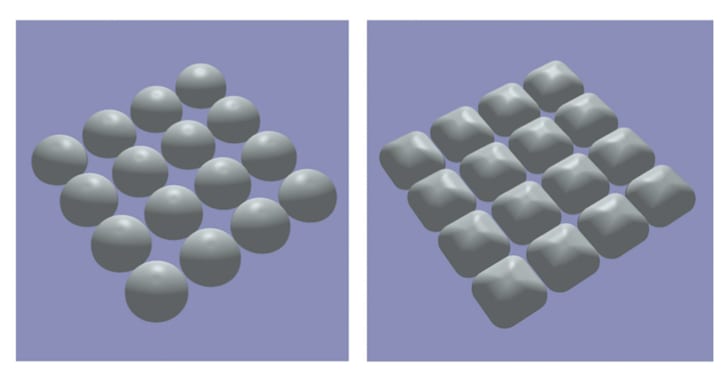 Favorable economics isn’t the only reason for the adoption of wafer-level lens manufacture. This process makes it possible to manufacture optical components that have functionality far beyond what polished glass or injection-molded plastic lenses can achieve. For example, using wafer level processing it is no more difficult to make axially symmetric lenses than asymmetric lenses. Close-packed lens arrays are optically more efficient when the lenses are rounded squares, rather than circles. As can be seen by comparing the two cases in Figure 3, the fill factor of the square-base lenses is proportionately higher. Another benefit of wafer level manufacture is that the two optical surfaces of each lens are made using totally independent processes. This means their shapes have no physical connection and they can even be different sizes. More interesting still is that the two optical surfaces can be produced from different materials possessing different optical properties.