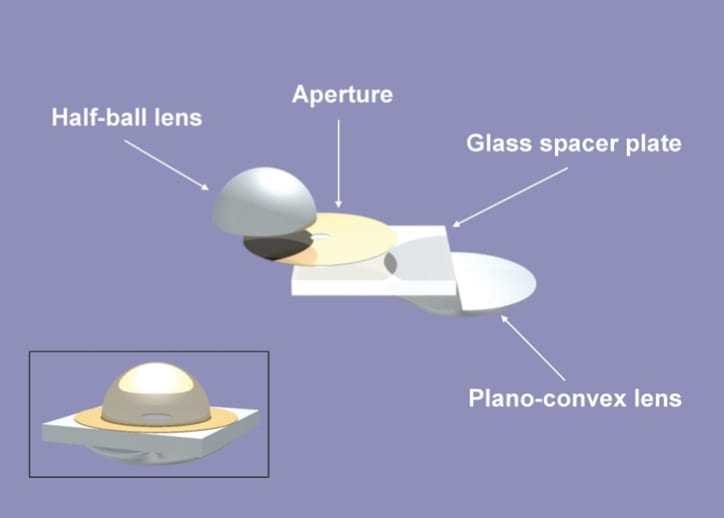 The optical train of a camera module consists of more than just lenses. To function correctly it must also contain, apertures, infrared filter, pupils, and anti-reflection coatings to name a few. All of these components can be realised with semiconductor processing techniques at the wafer level. The net result is a completely integrated optical component that has all the functionality necessary for a solid state camera. Figure 4 shows an innovative example of the type of integrated optical component that can be realized using wafer-scale lens manufacturing techniques.