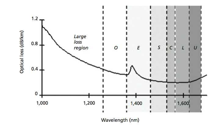 Single-mode light guiding is a prerequisite for long-distance transmissions (from a few kilometers to thousands of kilometers) as it is not possible to compensate for distortions caused by the presence of different light modes inside the fiber. Cut-off wavelength, λc, is a common characteristic of single-mode fibers; it defines the range of wavelength values for which fiber can operate in the single-mode regime (above λc). Typical transmission fibers guarantee a single-mode regime above 1300nm or 1450nm, enabling transmission inside the suited standardized ITU transmission windows (Figure 1).