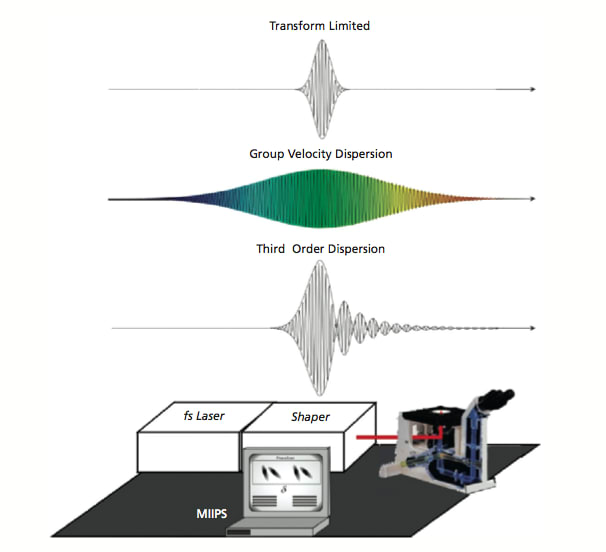 The use of an adaptive optical device, as shown in Figure 1, allows one to measure and correct the chromatic dispersion at the focal plane without the use of interferometry. Such a device was first demonstrated by the Dantus group in 20041. The principle of operation is similar to that used in noise canceling earphones - the average noise is sampled and then the negative of the average noise is actively introduced, so that the average noise at the ear is cancelled. In this optical example, the dispersion is sampled and once measured, its negative is introduced to cancel all orders of chromatic dispersion at the focal plane. This entire process takes approximately one minute. The reader is referred to recent articles that describe this method, known as MIIPS, in greater detail [2, 3]. This award wining technology4, developed by the Dantus group at Michigan State University, has been patented and is now being commercialized by BioPhotonic Solutions Inc. and Coherent in their Silhouette pulse shaper.