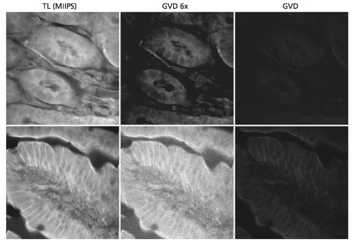 The use of MIIPS enables optimization of the use of sub-15 fs pulses in bio-medical imaging. The signal gain is significant when images acquired using MIIPS are compared to images acquired using GVD correction at the same location as shown in Figure 2.