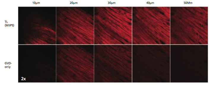 To study the implications of spectral phase correction for two-photon depth resolved imaging, we imaged a thick section of mouse heart tissue (Figure 3). The results shown here demonstrate increased penetration depth when higher-order dispersion is compensated by applying MIIPS, compared to GVD-only compensation. Additionally, our group has found that the increased efficiency gained by using ultrashort, TL pulses allows one to reduce the laser intensity incident on the sample leading to a significant reduction of light-induced damage and photobleaching 5.