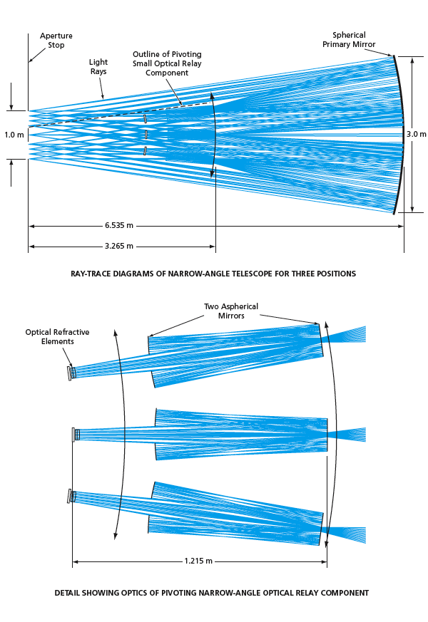 The pivoting relay segment of the narrow-angle telescope would include refractive and reflective optical elements, including two aspherical mirrors, to counteract the spherical aberration of the primary mirror. Overall, the combination of the primary mirror and the smaller relay optic would provide narrow-angle, diffraction-limited high resolution at a wavelength of 500 nm.
