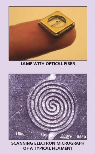 Lamps of this type containing tungsten and tungsten/rhenium filaments have been operated in laboratory tests at temperatures up to 2,650 and 2,725 °C, respectively. At an input power of ≈2 W, each lamp generates a luminous flux of about 1.5 lumens.
