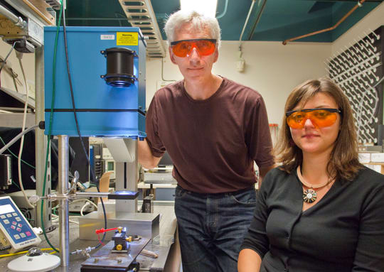 “When we illuminated the BFO thin films, we got very large voltages, many times the band gap voltage of the material itself,” says Ager. “The incoming photons free electrons and create corresponding holes, and a current begins to flow perpendicular to the domain walls – even though there’s no junction, as there would be in a solar cell with negatively and positively doped semiconductors.”