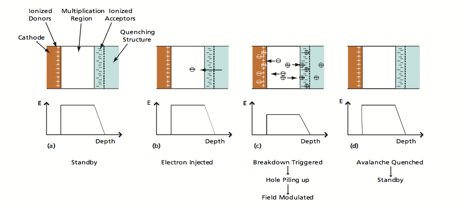 Novel detection capabilities this innovation will enable include more convenience in single-photon detection in comparison with traditional Geiger mode avalanche photodiodes that require an external quenching circuit and a photomultiplier that is bulky and requires high voltage. With this design, single-photon detection ranging from UV (ultraviolet) to FIR (far infrared) will be enabled in the light of the structure with regard to various semiconductor materials, including silicon, germanium, silicon-germanium, SiC, III-V compounds (e.g., InGaAs/InP heterostructure, GaN and GaN/AlN), II-V compounds (e.g., HgCdTe), etc. This detector may enable the highest achievable photon counting rate up to several gigahertz due to the removal of external, parasitic capacitance, extremely small junction capacitance, and largely eliminated after-pulsing effects originating from the infinitesimally small volume of the multiplication region.