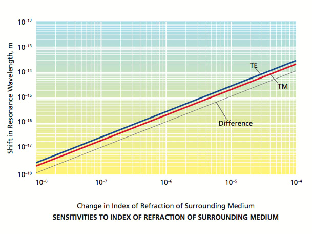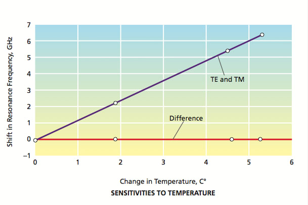Hence, by using the change in the difference between their resonance frequencies (instead of the change in either resonance frequency alone) as the measurement quantity, one effectively reduces the undesired temperature sensitivity to about 10–5× the temperature sensitivity of either mode considered alone. This choice of the measurement quantity also reduces the sensitivity to the environmental change of interest, but not so much as to make the sensor unusable: typically, the sensitivity to the environmental change of interest does not vary so much × that of either mode considered alone, as illustrated in the lower part of the figure. The net effect is that the ratio between the desired measurement signal and the undesired temperature-induced signal is 105 times that attainable through measurement of the resonance frequency of a single TM or TE mode.