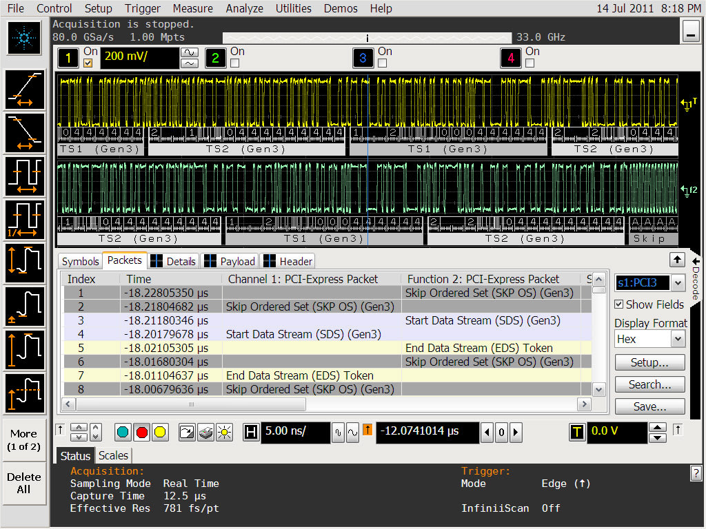 The N8816A Infiniium PCI Express 3.0 protocol analyzer software from Agilent Technologies (Santa Clara, CA) provides the ability to perform 128/130 bit and 8b/10b based packet decoding via a patented (patent pending) technique to capture and display serial data synchronized with the analog view of traffic of a serial data stream. Decode is displayed directly on the analog waveform as well as in the decode list with associated time and index displays. In conjunction with the decode list, using the multi-grid waveform display you can simultaneously display analog bi-directional waveforms with corresponding decode listings. The software helps engineers identify protocol errors and simultaneously analyze analog waveform characteristics.