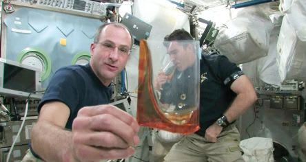 The free surface profile, governed by surface tension forces, was sufficient to keep the water from spilling during normal cup motions, thus allowing for the cup to be moved about like one would normally do for drinking beverages during a meal. Unlike on Earth, the cup could not be set on a table, but it could be parked on a wall and when desired, picked “up” for a sip.