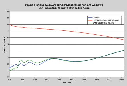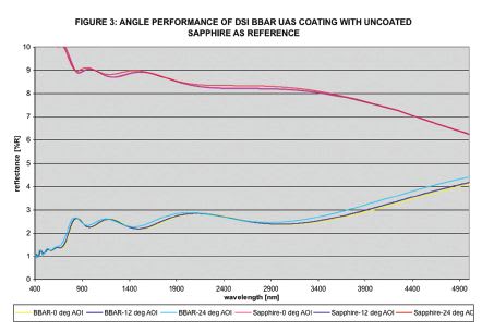 Antireflection coatings (AR, ARC) show the greatest reduction in reflectance at a single wavelength or over a very narrow wavelength range. In general it is difficult to attain very low reflectance over more than a 2X range in wavelength. In order to get very broadband performance, the coating designer must strike a compromise between reflectance level and bandwidth. This is the approach used by Deposition Sciences, Inc. (DSI) in designing broadband antireflection (BBAR) coatings for UAS application. The graph in Figure 2 shows BBAR coating performance with a cone-angle average of fifteen degrees. Figure 3 indicates the angle performance of new UAS BBAR coatings from DSI.