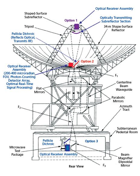 Option 2: Alternately, the optical com munications assembly could be located near the first available focal-spot F1 following reflection by the subreflector (which would have to be polished), next to the input to the beam waveguide on the main reflector as shown in the figure. This placement requires an RF/optical dichroic that reflects optical but transmits RF wavelengths, which can be implemented as a dielectric-coated pellicle, similar to commercial pellicle dichroics currently available in sufficiently large sizes. However, since this placement requires the pellicle to transmit large amounts of RF power in transmit mode, careful design will be required to ensure that the pellicle is not damaged due to absorption of RF energy during uplink transmission. Since the effective focallength after subreflector magnification is about 100 m, the estimated spot-size at F1 is 2–4 cm in diameter, requiring the development of large-area photon-counting array detectors for best performance. However, the spot-size can be decreased by a factor of 3 to about 1 cm using commercially available optics, relaxing the requirements on the detector array to manageable proportions. Option 3: Finally, the optical communications assembly could be placed inside the pedestal room, and separated from the RF signal after the ellipsoid and before the signal reached the microwave receiver via an RF/optical dichroic near F3, as shown in the figure. This placement would require polishing and coating the inner portions of all five mirrors of the beam waveguide (BWG) to very high optical reflectivity, but would have the advantage of protecting the optical communications assembly from the elements. If the mirrors could be polished to 95% reflectivity, then a loss of 0.955=0.77 would occur to both the optical signal and the background, which is only about 1 dB and hence would not impact communications performance significantly. However, this option is the most complicated to implement, requiring large-scale resurfacing of the BWG mirrors in addition to polishing the subreflector, hence it would likely incur the greatest cost.