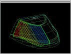 Figure 2: Simulation of a 0/90-degree Ply Lay-Up on a helicopter fairing. True fiber orientation varied significantly from target orientation during lay-up, causing the part to warp during the cure cycle. Fiber deviation is shown in yellow and red.A composite sandwich helicopter fairing (see Figure 2). The fairing laminate is made of a foam core sandwiched between two skins. Each skin consists of several ply layers. For optimal part performance, the design should create a quasi-isotropic lay-up of plies in which there is an equal distribution of fiber directions. A simulated lay-up revealed a difference between target and true fiber orientation, resulting in an unusable part. In the initial design, lay-up of a 0/90-degree ply started at the front. The fiber direction was expected to remain the same across the entire fairing, but the shape of the tool shifted fiber orientation 45° at the back of the ply and created a large region of non-quasi-isotropic fiber orientation in the manufactured part. This resulted in a non-symmetric laminate, which in turn caused the part to warp unacceptably during the curing cycle. In this case, the design was revised to achieve a quasi-isotropic lay-up of plies, which eliminated the warping and brought the finished part within specifications.