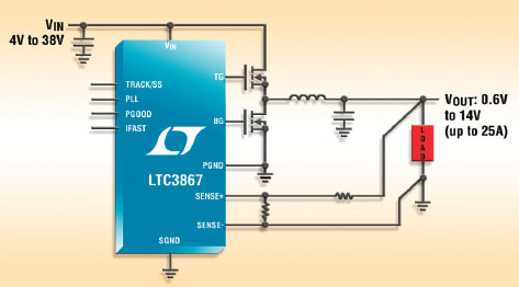 Linear Technology Corp. (Milpitas, CA) offers the LTC3867 fixed-frequency synchronous step-down DC/DC controller with nonlinear control, differential output voltage sensing, and clock synchronization. The 4V to 38V input range encompasses a variety of applications including intermediate bus voltages. Onboard N-channel MOSFET gate drivers allow the use of high-power external MOSFETs for high load current up to 25A. Output voltage is 0.6 to 14V.