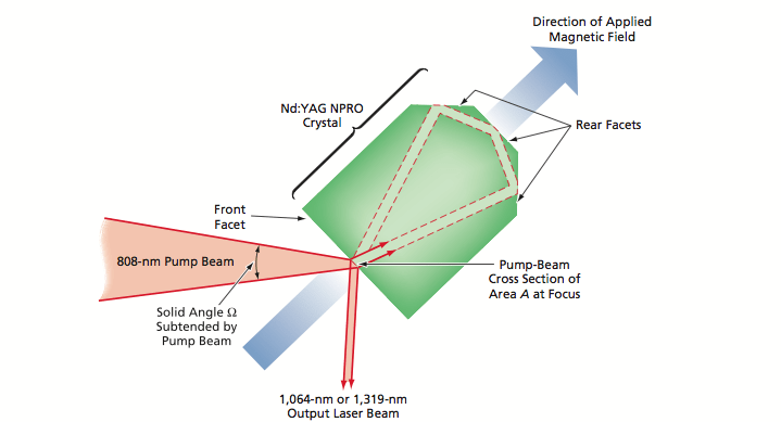 Figure 1 schematically illustrates the principle of operation of a laser-diode-pumped Nd:YAG NPRO. The laser beam path is confined in a Nd:YAG crystal by means of total internal reflections on the three back facets and a partial-reflection coating on the front facet. The wavelength of the pump beam — 808 nm — is the wavelength most strongly absorbed by the Nd:YAG crystal. The crystal can lase at a wavelength of either 1,064 nm or 1,319 nm — which one depending on the optical coating on the front facet. A thermal lens effect induced by the pump beam enables stable lasing in the lowest-order transverse electromagnetic mode (the TEM00 mode). The frequency of this laser is very stable because of the mechanical stability of the laser crystal and the uni-directional nature of the lasing. The uni-directionality is a result of the combined effects of (1) a Faraday rotation induced by an externally applied magnetic field and (2) polarization associated with non-normal incidence and reflection on the front facet.