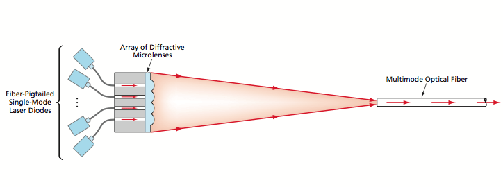 In the present approach (see Figure 2), the beams from multiple fiber-pigtailed single-mode laser diodes are coupled to single-mode optical fibers that have been placed together in a hexagonal-close-packing planar array. An array of diffractive microlenses, custom-designed and fabricated on a glass substrate by electron-beam lithography, is placed in front of the fiber array. The custom design and position of the lens array are chosen, according to the precisely measured actual positions of the fibers, so that the single-mode beams emerging from all the single-mode optical fibers are focused on the same small circular spot centered on the input face of a suitable multimode optical fiber. In use, the beam emerging from the output end of the multimode fiber would be focused onto the front facet of an Nd:YAG NPRO crystal in the usual way. It is anticipated that the AΩ of the pump light thus incident on the crystal would be less than the maximum single-frequency-lasing value.