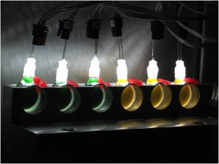At the Bio-SANS, the bacteria are loaded into cuvettes, small sample holders that resemble tiny transparent banjos. An LED is fixed to the top of each cuvette. The array is then pushed into the sample holder and the neutron beam passes through a window, taking "pictures" of the response of the layers of the bacteria to variations in light from the attached LEDs.