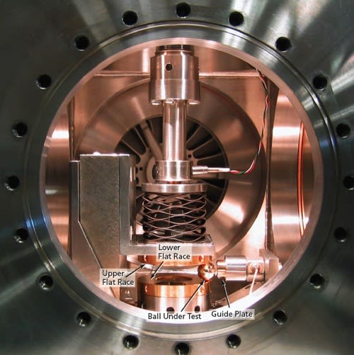 The ball is pressed between the lower and upper races with a controlled force and the lower plate is rotated. The combination of load and rotation causes the ball to move in a nearly circular orbit that is, more precisely, an opening spiral. The spiral’s pitch is directly related to the friction coefficient. At the end of the orbit, the ball contacts the guide plate, restoring the orbit to its original radius. The orbit is repeatable throughout the entire test. A force transducer, mounted in-line with the guide plate, measures the force between the ball and the guide plate, which directly relates to the friction coefficient. The SOT, shown in the figure, can operate in under ultra-high vacuum (10–9 Torr) or in a variety of gases at atmospheric pressure. The load force can be adjusted between 45 and 450 N. By varying the load force and ball diameter, mean Hertzian stresses between 0.5 and 5.0 GPa can be obtained. The ball’s orbital speed range is between 1 and 100 rpm.