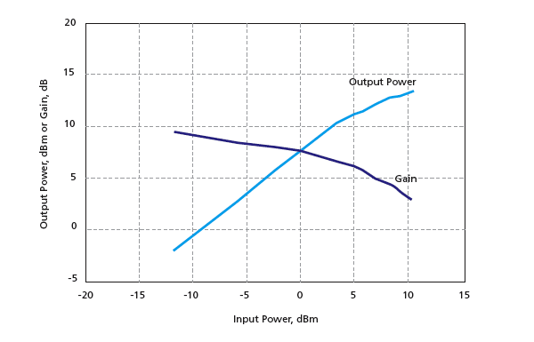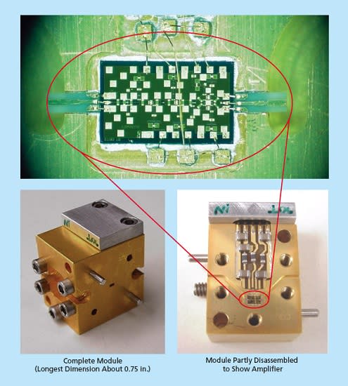 Figure 2 presents results of one of several tests of the amplifier module — measurements of output power and gain as functions of input power at an output frequency of 150 GHz. Such an amplifier module has many applications to test equipment for power sources above 100 GHz.
