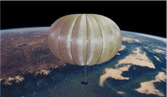 For example, the pumpkin balloon shown in the figure is made from a complex composite of polyester fabric, adhesive, polyethylene terephthalate film, and polyethylene film. The balloon has an areal mass density of 62 g/m2 and a total mass of 2,800 kg. The balloon can carry a payload of 1,600 kg at an altitude of 33 km. One corresponding meshed-pumpkin design calls for reinforcement of the membrane with a 1-by-1-in. (2.54-by-2.54-cm) mesh of polybenzoxazole scrim fiber of 25 denier (a lineal mass density of about 2.8 mg/m). With this reinforcement, the complex composite membrane could be replaced by a simple polyethylene film 0.5 mil (12.7 μm) thick, reducing the mass of the balloon to <400 kg. The mesh would provide a strength of 400 N/m, giving a factor of safety of 5, relative to the strength required for a pumpkin balloon with a bulge radius of 8 m.